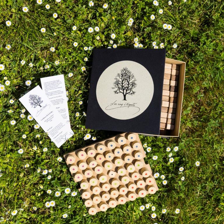 Il s’agit également d’un projet de territoire, valorisant les rebuts industriels en s’appuyant sur les savoir-faire locaux. L’ensemble des matériaux a été collecté, à titre gratuit, auprès d’une tonnellerie pour les pièces de bois (Seguin-Moreau), de deux entreprises de bouchages pour les bouchons de liège (Amorim ; Bouchages Delage), d’une imprimerie pour les stickers (Lithobru), d’une société d’emballage pour les intercalaires carton (DS Smith), de l’Atelier Lacotte pour les règles du jeu, d’une entreprise de packaging pour les coffrets (Comatec), ainsi que pour la logistique, le stockage et les échanges de réseaux : Oenowood International, Géodis, l’entreprise Bois, Maître Douelle, Atlanpack et Actilev.
